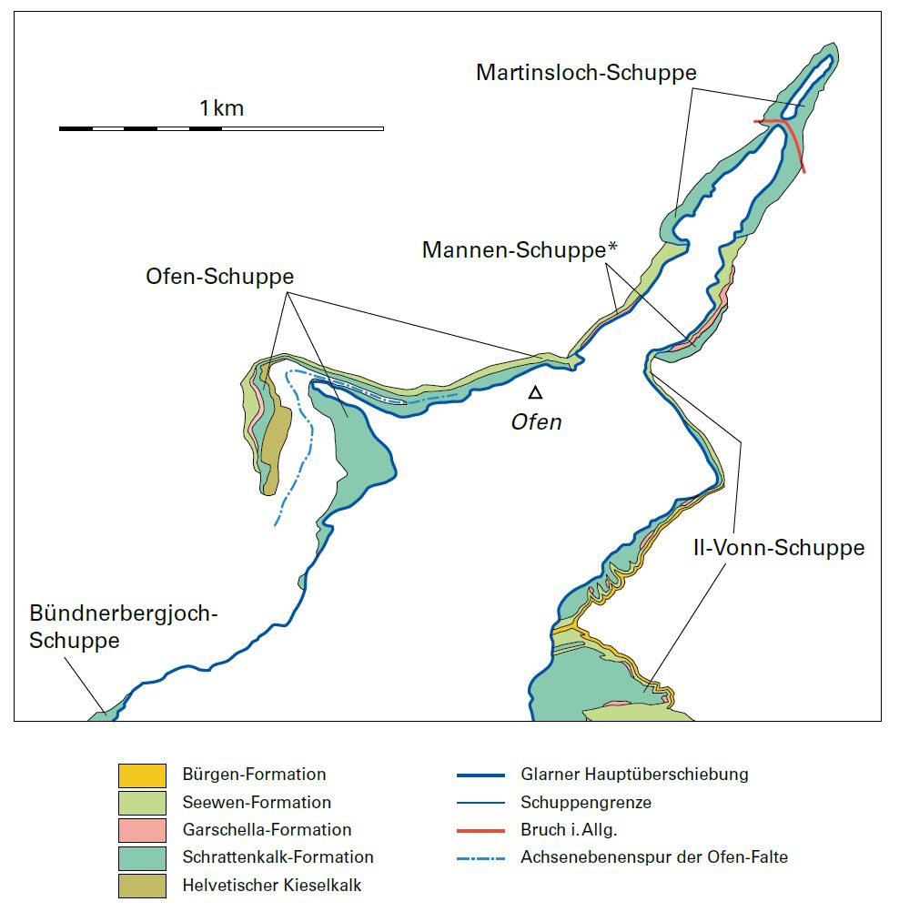 S.18: Tschingelhörner-Schuppen (7): Auf dem Schabell-Melange liegen an verschiedenen Orten die Tschingelhörner-Schuppen. Dies sind allochthone Teile der Sedimentbedeckung des Aar-Massivs (Frühe Kreide – Eozän), die als Relikte frontaler Partien der helvetischen Decken des Hangenden in späteren Phasen der Überschiebung unter die Hauptüberschiebung gerieten und überfahren wurden.